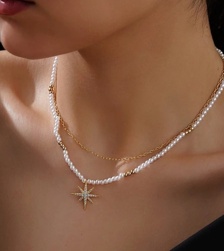 گردنبند زنانه ستاره و مروارید طلایی دو رج