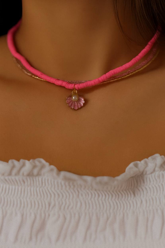 گردنبند زنانه صدف و مروارید صورتی سه رج ضد حساسیت