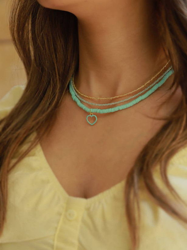 گردنبند سه رج فیروزهای قلبی ترکیبی زیبا از زنجیر طلایی ظریف و مهرههای فیروزهای با آویز قلب است که ظاهری شاد و دخترانه به استایل شما میبخشد. این گردنبند سبک و خاص، مناسب برای استفاده روزمره، ساحلی و تابستانی است و بهراحتی با لباسهای رنگ روشن ست میشود